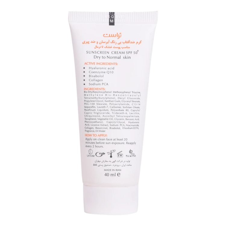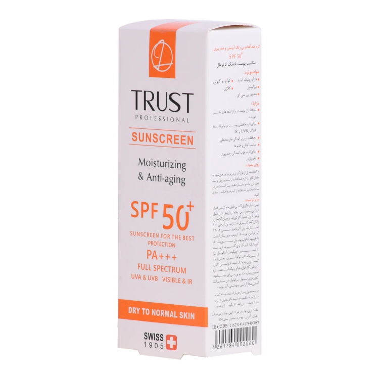 تفاوتی نمیکند تابستان باشد یا زمستان، هوا آفتابی باشد یا ابری، پوست بدن ما تحت هر شرایطی دربرابر تابش اشعههای مضر خورشید همچون UVA، UVB و IR به محافظت احتیاج دارد. اگر پوست صورت و بدن بدون محافظ در معرض آفتاب قرار بگیرد، در بلندمدت میتواند به پیری زودرس، چینوچروک، لکهای پیری، آفتاب سوختگی و حتی سرطان پوست منجر شود. کرم ضدآفتاب و ضدپیری SPF +50 تراست، با استفاده از مرغوبترین و جدیدترین مواد اولیه همچون هیالورونیک اسید و کوآنزیم کیوتن از پوست شما دربرابر پرتوهای مضر آفتاب به طور کامل محافظت میکند. این کرم علاوه بر مهار رادیکالهای آزاد و محافظت از پوست دربرابر آلودگیهای محیطی، از تخریب سلولهای پوستی، بروز چینوچروک، پیری زودس و لکهای ناشی از آفتاب نیز جلوگیری میکند. این محصول بافتی سبک داشته و با قابلیت جذب سریع و آبرسانی قویِ پوست خشک و حفظ رطوبت آن، پس از مصرف منافذ پوستی را نبسته و هیچ خللی در روند تنفس سلولهای پوستی ایجاد نمیکند. روش مصرف: 20 دقیقه قبل از قرارگیری در برابر نور خورشید به مقدار کافی از کرم ضدآفتاب تراست بر روی پوست تمیز قرار داده و ماساژ دهید. همچنین بهتر است هر دو ساعت یک بار کرم را تمدید کنید. * در ضمن در ترکیبات کرم ضدآفتاب و ضدپیری تراست، از پارابن استفاده نشده است.