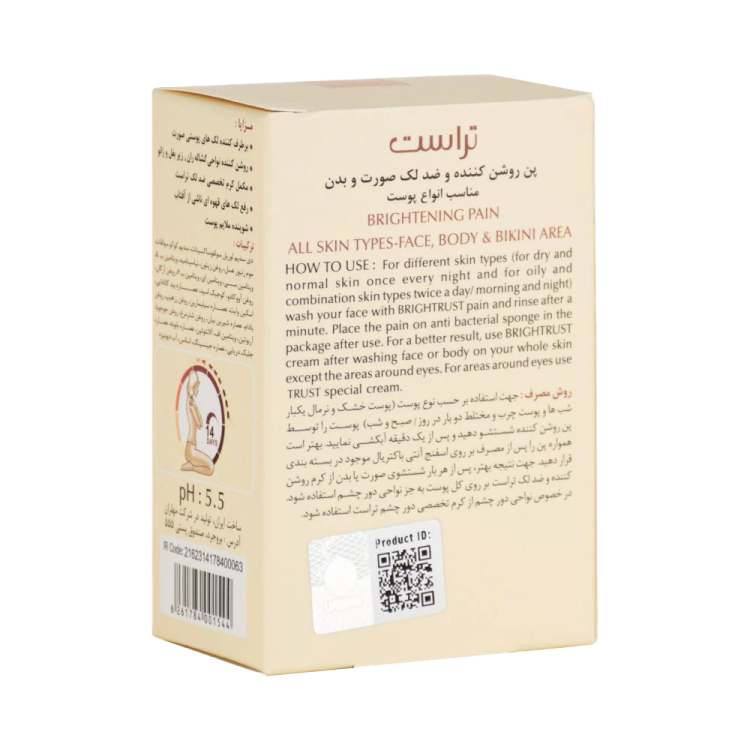 استفاده از این پن برای تاثیرگذاری بیشتر در کنار کرم ضد لک و آکنه و همچنین ضد آفتابها توصیه میشود. پن روشن کننده و ضد لک تراست با خاصیت روشن کنندگی پوست، ضمن حفظ رطوبت مناسب و کنترل چربی پوست شما، با از بین بردن لکها و تیرگیهای پوست به شفافیت، زیبایی و سلامت پوستتان کمک میکند. همچنین از ویژگیهای منحصربهفرد این پن، خاصیت روشن کنندگی برای پوست، نواحی زیر بغل و کشاله ران است. متناسب با نوع پوست، شستوشو بین روزی 1 تا 2 بار به مدت یک دقیقه است. برای اثرگذاری بیشتر، پس از شستشو با این محصول، روزها از کرم ضدلک و روشنکننده تراست و شبها از سرم روشن کننده و کرم روشن کننده تراست استفاده کنید.