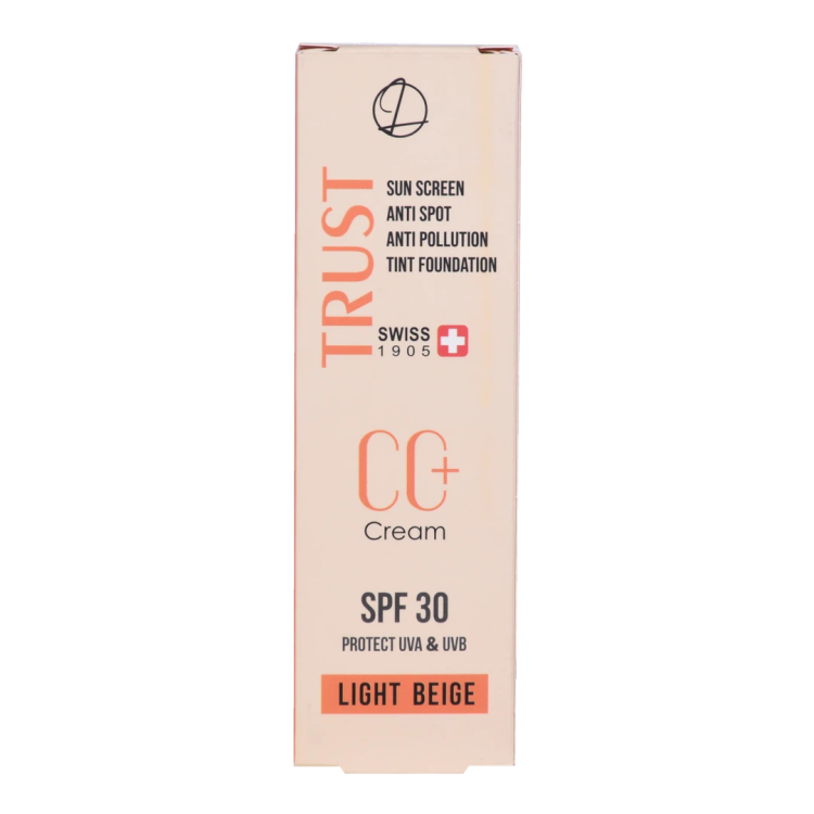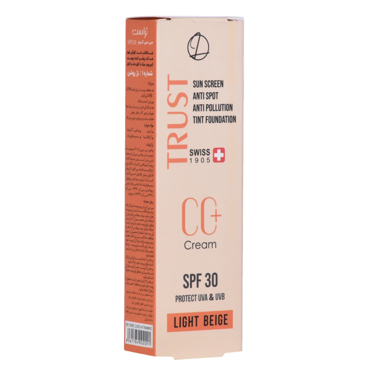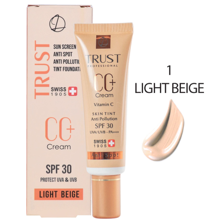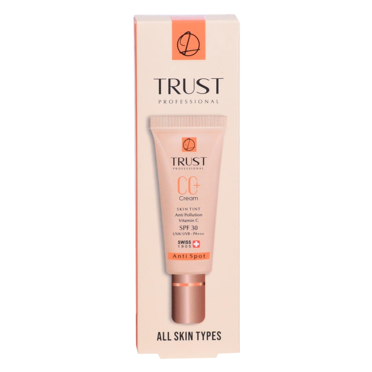 سی سی کرم یا کرم اصلاحکننده رنگ صورت (color corrector) محصولی است که به بهبود رنگ پوست و رفع ضایعات پوستی کمک کرده و پوست را روشن میکند. این کرم تیرگیها و لکها را برطرف کرده و ظاهر پوست را بهبود میبخشد. علاوه بر این، با داشتن SPF، از پوست دربرابر پرتوهای خطرناک نور خورشید محافظت میکند. سی سی کرم پلاس تراست، به طور اختصاصی به روشن شدن پوست و برطرف کردن جای جوش و لکهای پوستی کمک میکند. این محصول بهطور همزمان با آبرسانی پوست، از ایجاد لکهای جدید در پوست جلوگیری مینماید. ترکیبات آربوتین، میتوکینیل، ویتامین سی، نیاسینامید و آزلوگلیسین به صورت همافزا، از تولید رنگدانههای ملانین جلوگیری کرده و به روشن شدن و رفع لکهای پوستی کمک میکنند. عصاره جلبک در این محصول باعث جلوگیری از ایجاد لکهای پوستی شده و همچنین وجود ترکیبات ضدالتهاب مثل عصاره گیاه اسپیرا اولماریا و بیزابولول در این محصول، التهابات ناشی از آکنه و سایر ضایعات پوستی را تسکین میدهد. روش مصرف: سی سی کرم را بر روی پوست تمیز قرار داده و به وسیله انگشت یا پد بر روی پوست پخش نمایید. پیشنهاد میشود پیش از استفاده از این محصول، از کرم آبرسان مطابق با نوع پوست خود و یا پرایمر تراست استفاده نمایید. جهت پاکسازی پوست، توسط محصولات تراست مراحل زیر را به ترتیب انجام دهید: مرحله 1: ابتدا با میسلار واتر و یا پاککننده دوفازی، پوست خود را پاک نمایید. مرحله 2: پوست خود را توسط ژل شستشو یا پن (مطابق نوع پوست خود)، شستشو نمایید. مرحله 3: از تونر مغذی تراست منطبق با پوست خود (چرب و مختلط یا خشک و نرمال) استفاده نمایید.