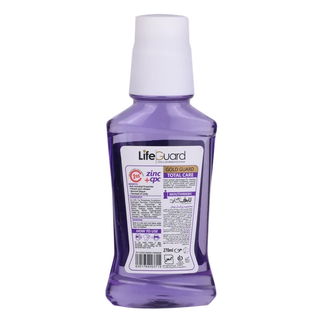 دهانشویه بزرگسال توتال (Gold Guard) برند لایف گارد برای بهداشت دهان و در حجم 270 میلیلیتر طراحی و تولید شده است؛ این دهانشویه، ویژگیهای منحصربهفردی دارد که به دهان شما حس و حال تازگی بخشیده و درخشش بینظیری را برای لبخند شما به همراه میآورد.