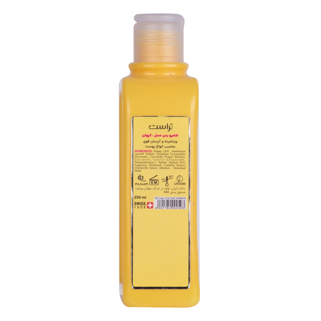 گاهی اوقات خیلی از ما بهدنبال محصولی هستیم که همزمان کار چند محصول را انجام دهد. مثلاً شویندهای که ضمن شستشوی بدن، آن را آبرسانی و روشن سازد. یا شامپویی که میزان تعرق بدن را نیز کاهش دهد. شامپو بدن عسل و Q10 تراست، حاوی عسل است که لایه رویی پوست را آبرسانی میکند و چین و چروکهای پوست را کاهش میدهد. همچنین این شامپو بدن با داشتن کوآنزیم کیوتن به تقویت سد دفاعی پوست کمک میکند و جلوی آسیب پرتوهای UV خورشید را میگیرد. عصاره بابونه موجود در این محصول ضدالتهاب و روشنکننده پوست است. تمامی افراد با انواع پوست میتوانند از این محصول استفاده کنند. روش مصرف: پوست بدن را به مقدار کافی از شامپو آغشته کرده و پس از 2 تا 3 دقیقه آبکشی نمایید. هشدارها: درب محصول پس از هر بار استفاده بسته شود. دور از نور مستقیم خورشید نگهداری شود. دور از دسترس اطفال نگهداری شود.