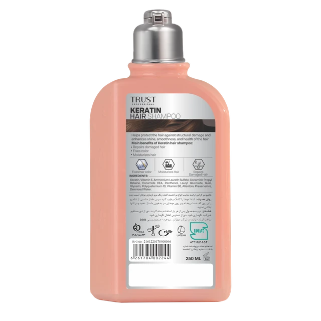 یکی از راههای دستیابی به موهایی سالم و بانشاط، استفاده از شامپوهایی است که دارای ویتامینها و مواد مغذی موردنیاز مو هستند. استفاده از این محصولات هم باعث استحکام و تقویت تارهای مو شما میشود و هم با شستشوی مناسب مو، از آن در مقابل آسیبهای محیطی مراقبت میکند. شامپو سر کراتین تراست، با دارا بودن کراتین و ویتامین E، با نرم کردن مو و کمک به استحکام ساختاری آن، مانع از شکستگی و آسیب تارهای مو میشود. این شامپو ضمن رفع وزی تارهای مو، به تثبیت رنگ، ترمیم و افزایش ضخامت مو کمک میکند. تمامی افراد با انواع مو میتوانند از این محصول استفاده کنند. روش مصرف: موهای مرطوب خود را به مقدار مناسبی شامپو آغشته کرده و پس از 1 دقیقه آبکشی نمایید. هشدارها: درب محصول پس از هر بار استفاده بسته گردد. دور از نور مستقیم خورشید نگهداری شود. دور از دسترس اطفال نگهداری شود.