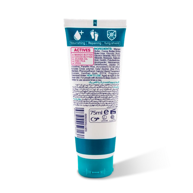 خشکی و ترک پا به دلایل مختلفی ایجاد می شود. ایستادن به صورت بلند مدت به خصوص در نواحی سفت، صندل هایی که انتهای باز دارند، راه رفتن با پای برهنه، آب و هوای سرد و خشک، چاقی، استحمام با آب داغ و به صورت بلند مدت و بیماری هایی مثل دیابت از عوامل اصلی ایجاد ترک در کف پا هستند. در صورت عدم مراقبت و با گذشت زمان ترک های پا عمیق تر می شوند و حتی ممکن است دچار خونریزی و در موارد شدید تر دچار عفونت های قارچی شوند. با ایجاد ترک ها در کف پا، فرد موقع ایستادن در این ناحیه احساس درد و ناراحتی کرده و پوست در این قسمت دچار پوسته ریزی، قرمزی و تورم می شود. پوست پا در این حالت مستعد انواع عفونت ها از جمله عفونت های قارچی است. بنابراین برای بهبود ترک های کف پا می بایست از محصولات مراقبتی و کمکی برای رفع و بهبود ترک های پا استفاده کرد. کرم ترمیم کننده ترک پا کلاس یک حاوی ترکیبات فعالی است که سلول های مرده ناحیه کف پا را با لایه برداری ملایم از بین برده و با آبرسانی به پوست در این ناحیه، از خشکی پوست در این ناحیه جلوگیری می کند. همچنین این محصول حاوی چند نوع کره گیاهی می باشد که وظیفه ترمیم و نرم کردن پوست را بر عهده دارد. ترکیبات ضد قارچی و ضد التهاب موجود در محصول از عفونت های قارچی در ناحیه پا جلوگیری کرده و به حفظ سلامت پاها کمک می کند. مواد موثره: کره انبه کره انبه حاوی مقدار زیادی ویتامین سی است که ساخت کلاژن را افزایش داده و با کمک به آبرسانی پوست، خشکی و ترک های پا را بهبود می بخشد. این ترکیب با داشتن خواص آنتی اکسیدانی منحصر به فرد، آسیب های پوستی ناشی از استرس های محیطی و پرتوهای UV را مهار کرده و با ترمیم سلول ها و بافت های آسیب دیده در ناحیه پا، نرمی و سلامت پاها را بهبود می بخشد. کره کاکائو کره کاکائو یک ترکیب نرم کننده بسیار قوی است که زبری و خشکی پوست پا را برطرف کرده و با توانایی که در بهبود بدترین نوع ترک های پا دارد، می بایست در روتین مراقبت از پا وجود داشته باشد. این ترکیب حاوی انواع مختلفی از اسیدهای چرب مقوی و آبرسان پوست است که با نفوذ عمیق به داخل پوست و آبرسانی سلول های پوستی، به نرمی پوست در خشک ترین نواحی بدن مثل ناحیه کف پا کمک می کند. روغن جوجوبا روغن جوجوبا سریعا جذب پوست شده و پوست را آبرسانی می کند. بنابراین روغن جوجوبا گزینه مناسبی برای درمان خشکی و زبری پوست در ناحیه پا است. این ترکیب به دلیل داشتن ساختاری مشابه با سبوم و ترکیبی غنی از ویتامین E، پوست را نرم کرده و با حفظ کشسانی پوست، از پوسته ریزی و ایجاد ترک های پوستی جلوگیری می کند. زینک پی سی ای سلول های موجود در ناحیه کف پا به دلایل مختلفی دچار آسیب شده و از بین می روند. این سلول های مرده در قسمت زیر پا تجمع می یابند و با گذشت زمان و خشک شدن پوست، به فرم ترک های پا ظاهر می شوند. زینک پی سی ای ترکیبی است که ضمن آبرسانی به سلول های پوستی، به ساخت سلول های پوستی جدید در ناحیه پا و حذف سلول های مرده در این ناحیه کمک کرده و بنابراین چرخه فعالیت تقسیم سلولی را تنظیم می کند. این ترکیب با داشتن خواص ضد التهابی و ضد قارچی، التهابات ناشی از آسیب های فیزیکی و محیطی به پوست را تسکین داده و با مهار تکثیر عوامل بیماری زا در ناحیه پا، از ایجاد عفونت قارچی و بوی بد پا جلوگیری می کند. اوره اوره ترکیبی آبرسان است که با قرار گرفتن در سطح پوست رطوبت را از محیط جذب کرده و به سلول های پوستی می رساند. این ترکیب سد دفاعی پوست را تقویت کرده و با کمک به حفظ رطوبت پوست، از خشکی و ترک های پا جلوگیری می کند. اوره توانایی بالایی برای نرم کردن و ترمیم سلول های پوستی دارد و بنابراین با استفاده در کرم ترک پای کلاس یک، خشکی و ترک های پوستی را بهبود می بخشد.