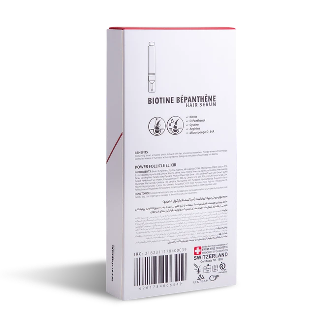 به چه دلیل باید از سرم تقویت کننده موی بیوتین بپانتن استفاده کنیم؟ داشتن موهایی زیبا و سالم در گرو مراقبت صحیح و تقویت موها با استفاده از محصولات آبرسان و تقویت کننده رشد مو است. بنابراین استفاده از محصولات تقویت کننده رشد مو میبایست قسمتی از روتین مراقبتی روزانه شما باشد. برای مثال یکی از مهمترین مزیتهای سرمهای تقویت کننده مو، آبرسانی سلولهای کف سر و تغذیه فولیکولهای مو با ویتامینها و ترکیبات موثره بهبود دهنده رشد مو است. این ترکیبات عملکرد موثری در کاهش یا توقف ریزش موها دارند و با افزایش خونرسانی و آبرسانی سلولها، به ساخت سلولهای جدید و حفظ سلامت پوست سر کمک میکنند. به همین دلیل سرم بیوتین بپانتن تراست به عنوان یکی از جدیدترین محصولات مراقبت از مو در راستای مراقبت از سلامت موها و پوست سر فرموله شده است. این محصول با بهرهگیری از ترکیبات موثره هوشمند بیوتین و بپانتن با قابلیت رهاسازی کنترل شده و با استفاده از تکنولوژی انتقالی اسپانجوزوم، به طور موثر و متفاوت با سایر محصولات، به داخل پوست سر نفوذ کرده و با فعال کردن مجدد فولیکولهای غیرفعال، به رویش مجدد موها و حفظ استحکام فولیکولهای مو کمک میکند. مزایای سرم موی بیوتین بپانتن تراست ü حاوی بیوتین هوشمند فعال شونده ü استفاده از بایو اکتیو بپانتن با جذب سریع ü فناوری پپتیدهای تقویتی ü رهاسازی کنترل شده مواد مغذی ü تحریک بیولوژیک فولیکولهای غیر فعال مواد موثره به کار رفته در محصول بیوتین پروتئین کراتین یک بخش حیاتی در ساختار مو است که به افزایش استحکام تارهای مو و جلوگیری از شکستن آنها کمک میکند. بیوتین به عنوان یکی از مهمترین ویتامین های مورد نیاز برای رشد موها و با داشتن قابلیت فعال شدن هوشمندانه، به طور موثری تولید پروتئین کراتین را بهبود بخشیده و بنابراین سرعت رشد موها را افزایش میدهد. این ویتامین مواد مغذی و ضروری را به فولیکولهای مو انتقال داده و ضمن تقویت و افزایش استحکام تارهای مو، از ریزش موها جلوگیری میکند. دی-پنتنول (بپانتن) دیپنتنول یکی از ترکیبات بایواکتیو با جذب بسیار سریع است که به عنوان ترکیبی مرطوب کننده برای درمان یا جلوگیری از خشکی، پوسته پوسته شدن، خارش و التهاب پوست سر عمل کرده و با آبرسانی به لایه سطحی پوست از تبخیر رطوبت از سطح پوست جلوگیری میکند. دیپنتنول از تولید بیش حد سبوم توسط غدد مولد چربی جلوگیری کرده و بنابراین ریزش موها را کاهش میدهد. سیستین سیستین یکی از آمینواسیدهای ضروری برای رشد مو است که با کمک به افزایش ساخت پروتئین کراتین به حفظ استحکام تار مو و تقویت رشد فولیکول مو کمک میکند. سیستین به عنوان عنصر کلیدی ضخامت تارهای مو را افزایش داده و سلامت موها را دو چندان میکند. آرژینین آرژینین یکی از موثرترین ترکیبات در افزایش رشد مو است که با کمک به افزایش گردش خون در ناحیه پوست سر، ترکیبات مغذی و اکسیژن را به طور مناسبی به فولیکولهای مو انتقال داده و با تحریک بیولوژیک فولیکولهای غیرفعال، رشد موها را افزایش میدهد. آرژینین سرعت تقسیم سلولها در ناحیه فولیکولهای مو را افزایش داده و بنابراین به افزایش رشد مو و داشتن موهایی سالم کمک میکند. میکرواسپانج سی154 آ میکرواسپانج سی ۱۵۴ آ نوعی سیستم انتقال موثر حاوی کافئین به سلولهای فولیکول مو است که به آزاد سازی کنترل شده و بلند مدت کافئین به سلولهای پوست سر کمک کرده و بنابراین تاثیرگذاری محصول را افزایش میدهد. این کمپلکس با انتقال موثر کافئین به سلولهای پوست سر، میزان نیتریک اکساید را کنترل کرده و سوخت و ساز سلولها را افزایش میدهد و بنابراین با کمک به ساخت سلولهای جدید به پاکسازی کف سر کمک میکند. کافئین با افزایش گردش خون در ناحیه فولیکول مو و اکسیژن رسانی موثر به سلولهای فولیکول، رشد موها را افزایش داده و از ریزش موها جلوگیری میکند. نحوه مصرف محصول قفل انتهای ظرف را باز کنید و با استفاده از اپلیکاتور انتهایی مقدار کافی از سرم بیوتین بپانتن را دو بار در روز مس