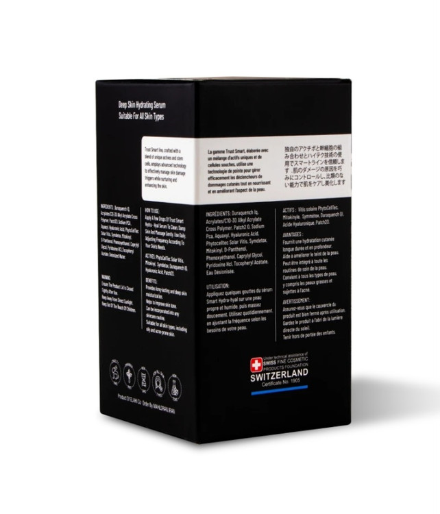 نحوه مصرف پس از شستشو و پاکسازی صورت، روزانه و در هر بار استفاده، چند قطره از سرم آبرسان تراست اسمارت را روی پوست مرطوب قرار داده و به آرامی به سمت بالا و بیرون ماساژ دهید.