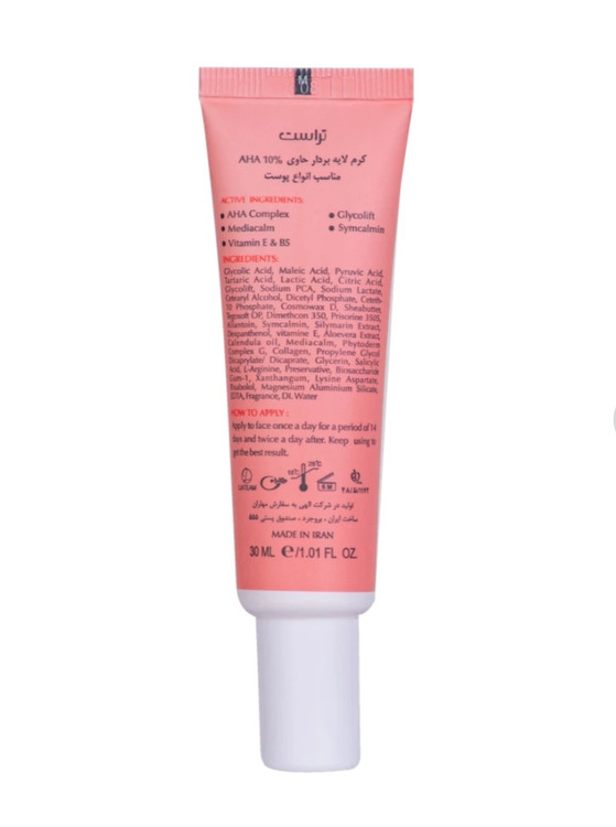 پوست ما همواره خودش را بازسازی میکند و سلولهای پوستی جدید، جایگزین سلولهای پیر، مرده، افتاده یا پوستهپوسته شده میشوند. هر دقیقه از هر روز حدوداً بین 30 تا 40 هزار سلول پوستی مرده از بدنمان جدا میشود. زمانیکه پوستمان به عارضههایی همچون پیری و خشکی دچار میشود، خبر میدهد که دیگر سلولهای مرده پوستمان حاضر نیستند از جای خود به راحتی کنده شوند؛ وقتی هم که این سلولها روی هم تلنبار میشوند، ظاهری کدر و زبر به خود میگیرند و با پر کردن منافذ پوستی، شما را به جوش و آکنه دچار میکنند. کرم لایهبردار تراست حاوی 10 درصد آلفا هیدروکسی با لایهبرداری سلولهای پیر و فرسوده، قدرت بازسازی پوست را به آن بازمیگرداند تا علاوه بر کم شدن میزان چینوچروکهای سطحی، پوستی یکدست، شفاف، جوان و روشن پیدا کنید. روش مصرف: جهت بکارگیری این کرم کافی است پوست صورتتان را به مدت دو هفته به صورت روزانه با مقدار مناسبی از آن ماساژ دهید. پس از گذشت این بازه زمانی 14 روزه، بایستی تا رسیدن به نتیجه مطلوب، روزانه 2 بار از آن استفاده کنید. استفاده از این کرم به خاطر داشتن کمپلکس AHA احتمال دارد حساسیت پوستتان نسبت به آفتابسوختگی را افزایش دهد. بنابراین به شما توصیه میکنیم در برنامه روزانهتان استفاده از کرمهای ضدآفتاب تراست را جای دهید.