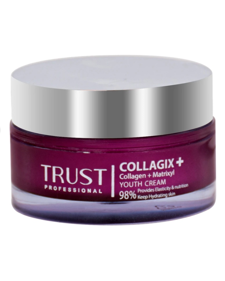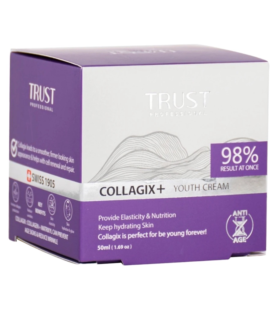 از آنجاییکه با افزایش سن و گذشت زمان، به صورت طبیعی، میزان تولید پروتئینهای استحکامبخش پوست کاهش یافته و پوست دچار چینوچروک میگردد، پوست به مراقبت و آبرسانی بیشتری نیاز دارد؛ بنابراین استفاده از محصولات تخصصی ضدچروک برای همه افراد ضرورت دارد. وجود کلاژن در ترکیب فرمولاسیون کرم جوانساز کلاژن تراست، علاوه بر حفظ ساختار سلولهای پوستی، از ایجاد چینوچروکهای پوستی جلوگیری کرده و به طرز مؤثری به بهبود خشکی پوست کمک میکند. کمپلکس سرامید موجود در این محصول، باعث تقویت و استحکام ساختار سلولهای پوستی شده و از تخریب سلولهای پوستی تحت تأثیر آسیبهای محیطی مانند تابشهای مضر خورشید، آلودگی هوا و گرمای شدید، جلوگیری میکند. همچنین با داشتن ترکیب فعال ماتریکسیل مورفومیکس، به طرز مؤثری چینوچروکهای صورت، به ویژه خطوط عمودی آن و چروکهای پنجه کلاغی را از بین برده و به تقویت ساختار پوست صورت کمک میکند. در کنار این سه ویژگی اصلی، این کرم جوانساز پوست، با داشتن هیالورونیک اسید، ضمن آبرسانی پوست، خاصیت سفتکنندگی و استحکامبخشی داشته و جلوی ایجاد چینوچروکهای پوستی را گرفته و به حفظ یکپارچگی آن نیز کمک میکند. همچنین، امگا 3 و امگا 6 موجود در این محصول، با تقویت سد دفاعی پوست، رطوبت پوست را حفظ کرده و از این طریق، مانع از خشکی و پیری پوست میشود. و در نهایت، پلی پپتاید آرژینین و لایزین موجود در کرم جوانساز کلاژن تراست، از ایجاد چینوچروک در پوست جلوگیری کرده و به حفظ شادابی و سلامت پوست کمک میکند. در کنار مواد مؤثره مطرحشده، این محصول تراست، با عصاره دانه لوپینوس آلبوس، به حفظ استحکام و افزایش خاصیت کشسانی پوست، با آسپارلین، به بهبود سوختوساز سلولهای پوستی و تکثیر آنها، با روغن آووکادو، به حفظ استحکام و پایداری پوست و با هلیانتوس آنوس سید اویل، به بهبود آبرسانی و جلوگیری از پیری پوست، کمک میکند. روش مصرف: مقدار مناسبی از کرم را بر روی پوست تمیز و شستهشده قرار داده و بهآرامی ماساژ دهید (2 بار در روز قابل استفاده میباشد). هشدار: درب محصول پس از هر بار استفاده بسته گردد. دور از نور مستقیم خورشید نگهداری شود. دور از دسترس اطفال نگهداری شود.
